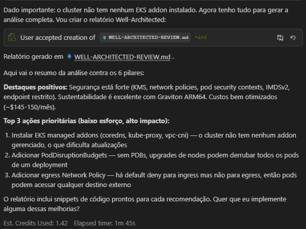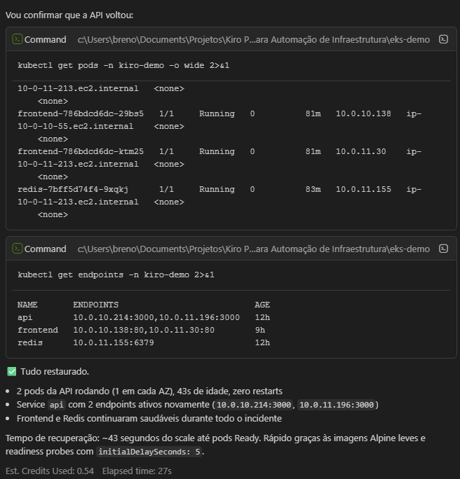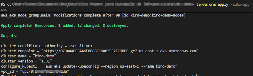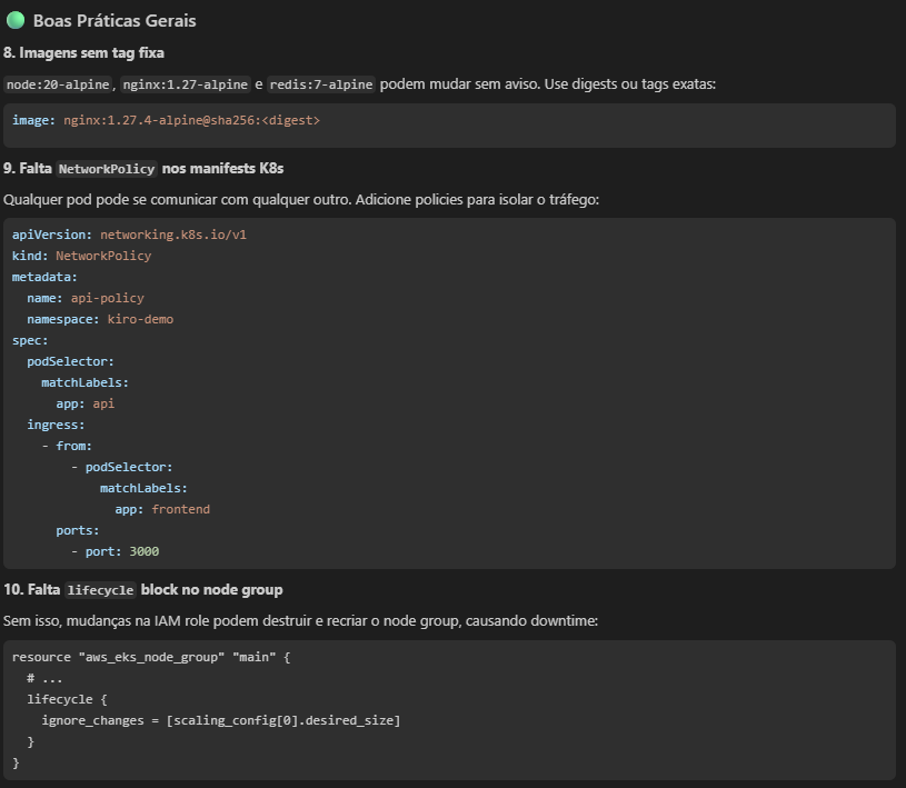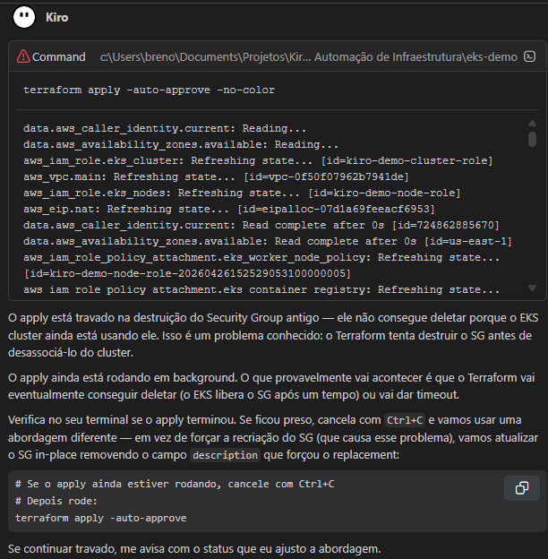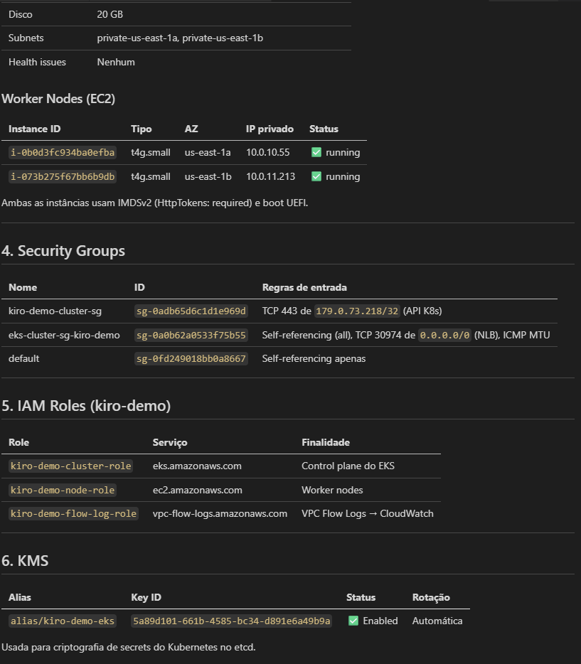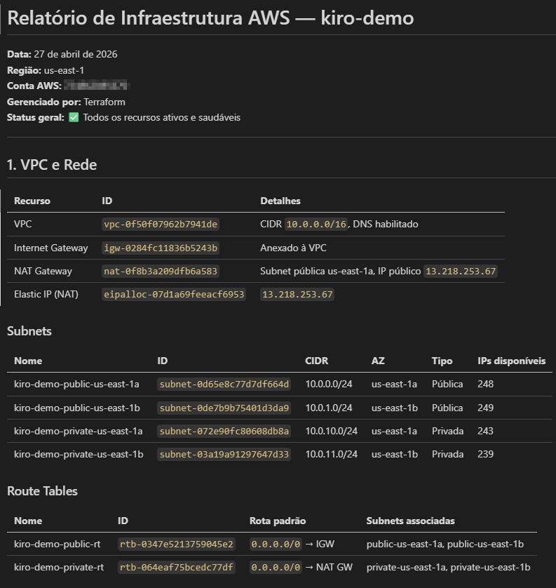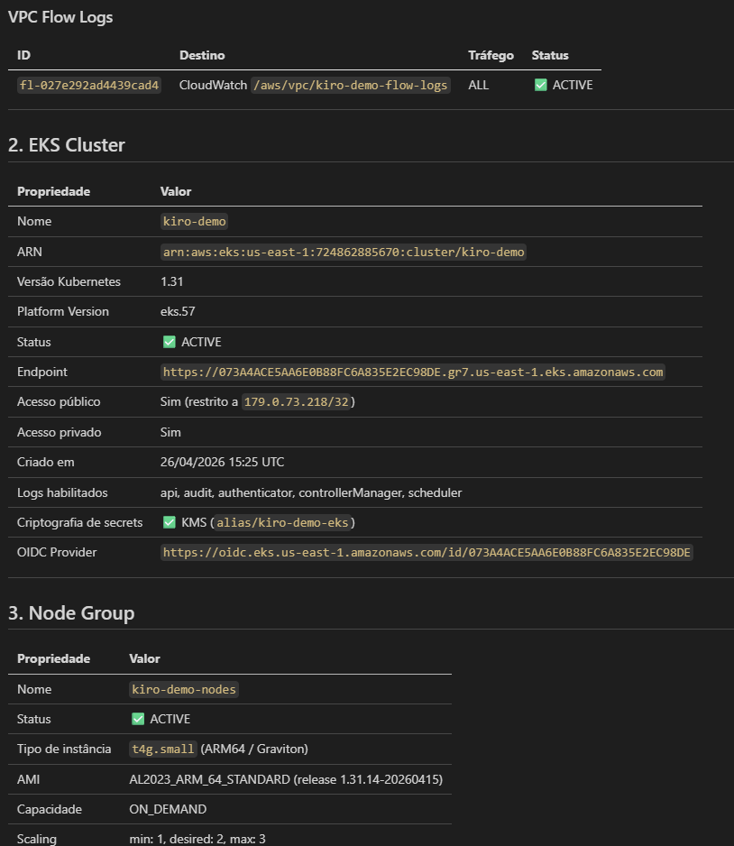 Finalizando essas configurações, vamos ao arquivo README.md, nele constam as informações completas do ambiente, tais como, pré-requisitos e como fazer o deploy do ambiente. Mas após a criação dos arquivos, o Kiro também descreve os detalhes e exibe na sua console:
