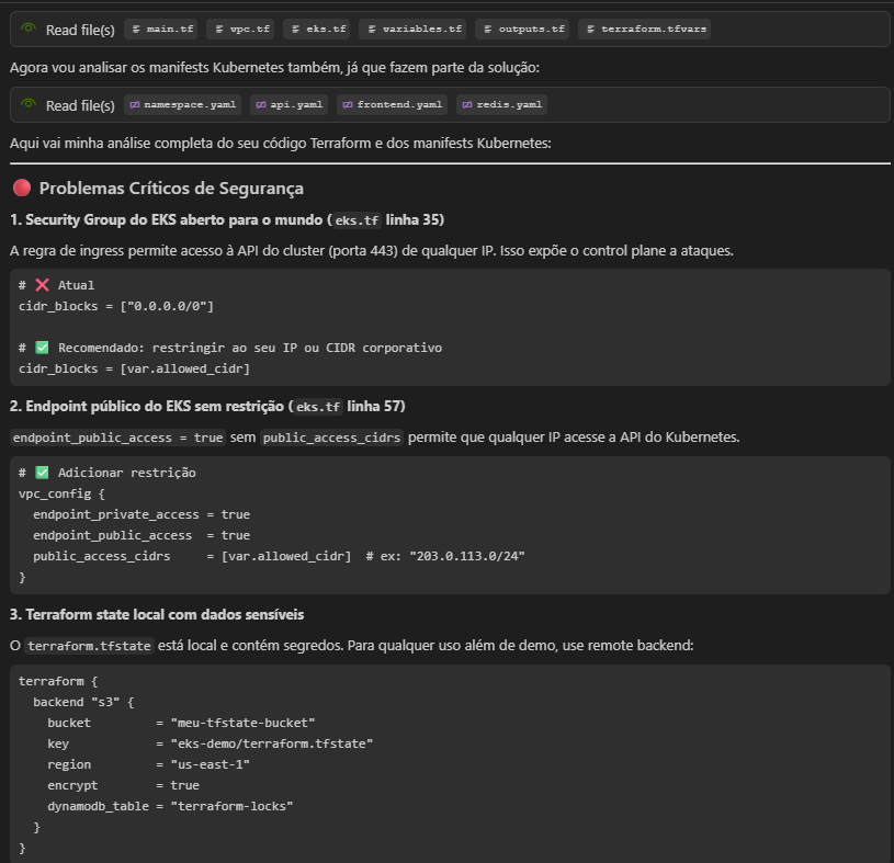 Agora, vamos utilizar o poder do Kiro, com um simples contexto ele criou todos os scripts para a implantação do cluster EKS com a aplicação do Mario que foi usado como exemplo.