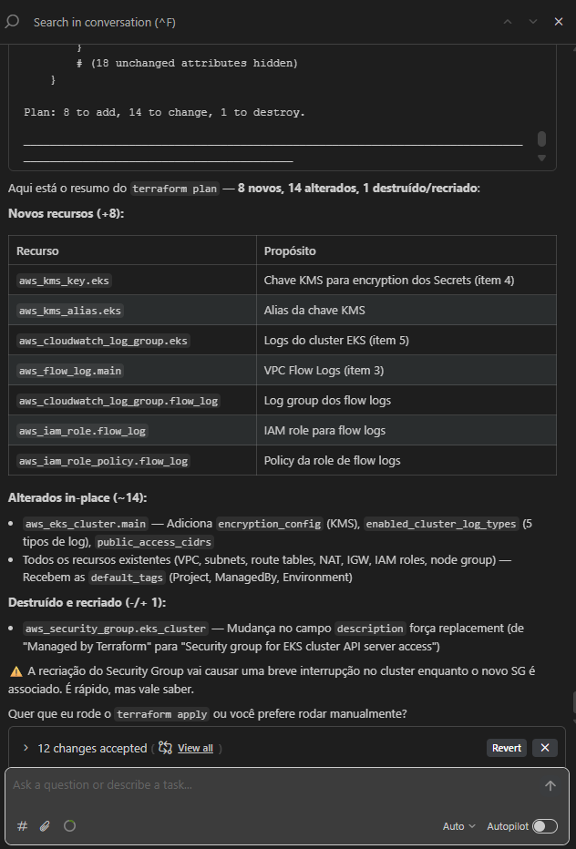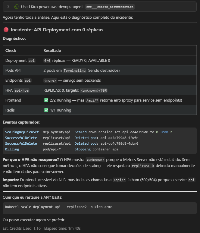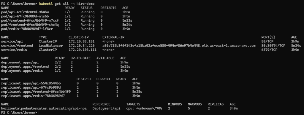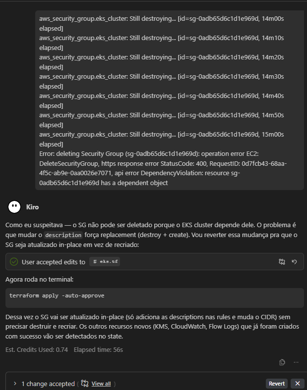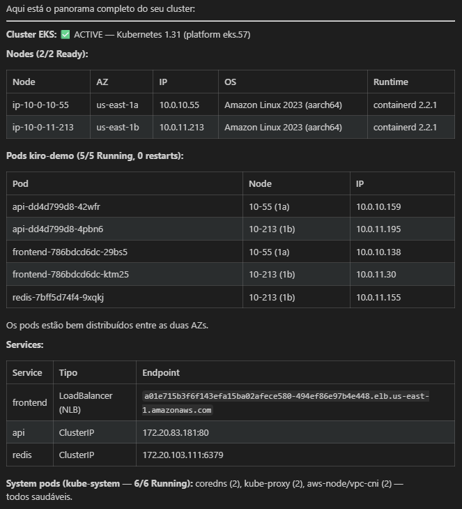 Aproveitando as novidades do re:invent 2025, gostaria de compartilhar esse tutorial demonstrando a possibilidade de montar uma arquitetura completa de uma aplicação executando AWS EKS (Kubernetes) através de Agentic AI para automatizar a criação de um cluster Kubernetes no AWS EKS com Kiro, reduzindo o tempo de entrega de um ambiente complexo. Mas calma aí! Tudo isso não elimina a necessidade do conhecimentos de infraestrutura, redes, monitoramento e segurança, pois esses conhecimentos serão necessários em no momento de realizar um troubleshooting do ambiente em um cenário real.