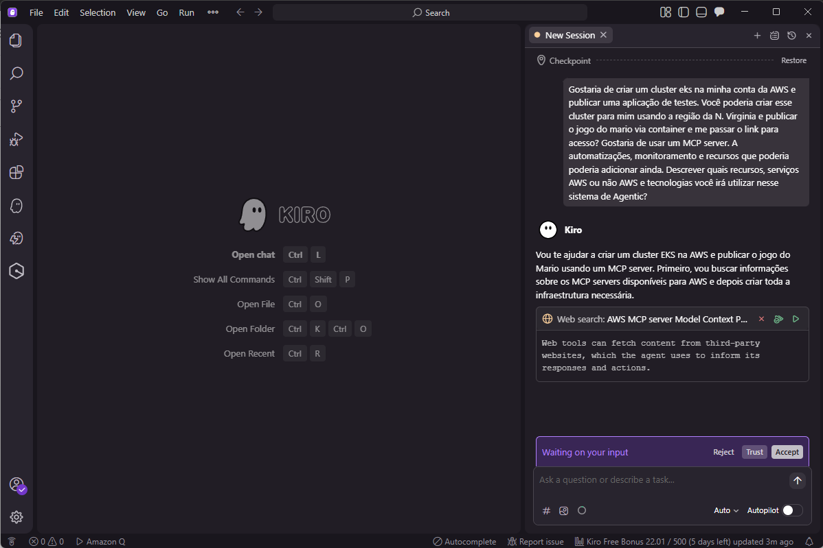 Digitamos Ctrl+L para abrir o chat do Kiro e inserirmos o contexto para receber o auxílio na criação do Cluster EKS: