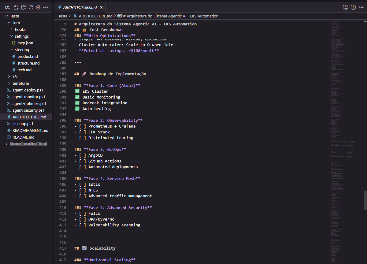 Finalizando essas configurações, vamos ao arquivo README.md, nele constam as informações completas do ambiente, tais como, pré-requisitos e como fazer o deploy do ambiente. Mas após a criação dos arquivos, o Kiro também descreve os detalhes e exibe na sua console: