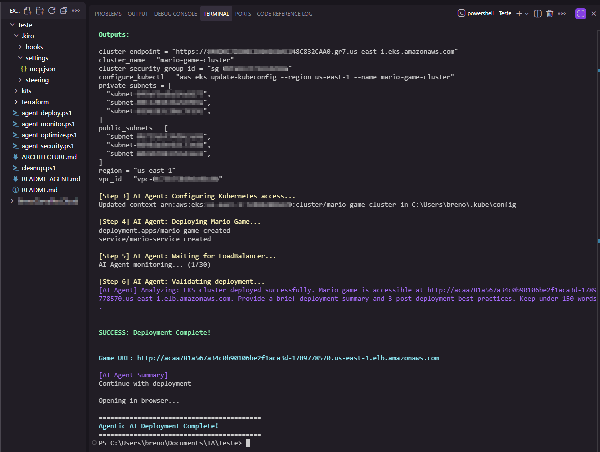 Agora, vamos utilizar o poder do Kiro, com um simples contexto ele criou todos os scripts para a implantação do cluster EKS com a aplicação do Mario que foi usado como exemplo.